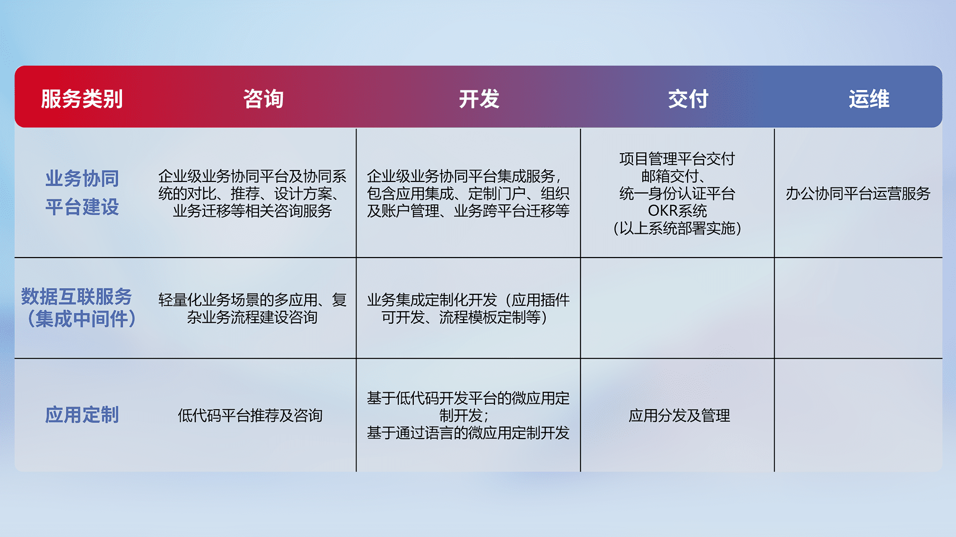 针对钉钉、、、、企微、、IDaas等平台级产品提供产品的规划、、方案、、、、交付、、、、定制化开发等服务,,,,实现如统一协同办公、、智能客户服务、、、、混合会议管理、、智能数据查询、、、等业务场景,,实现数字化转型。。。