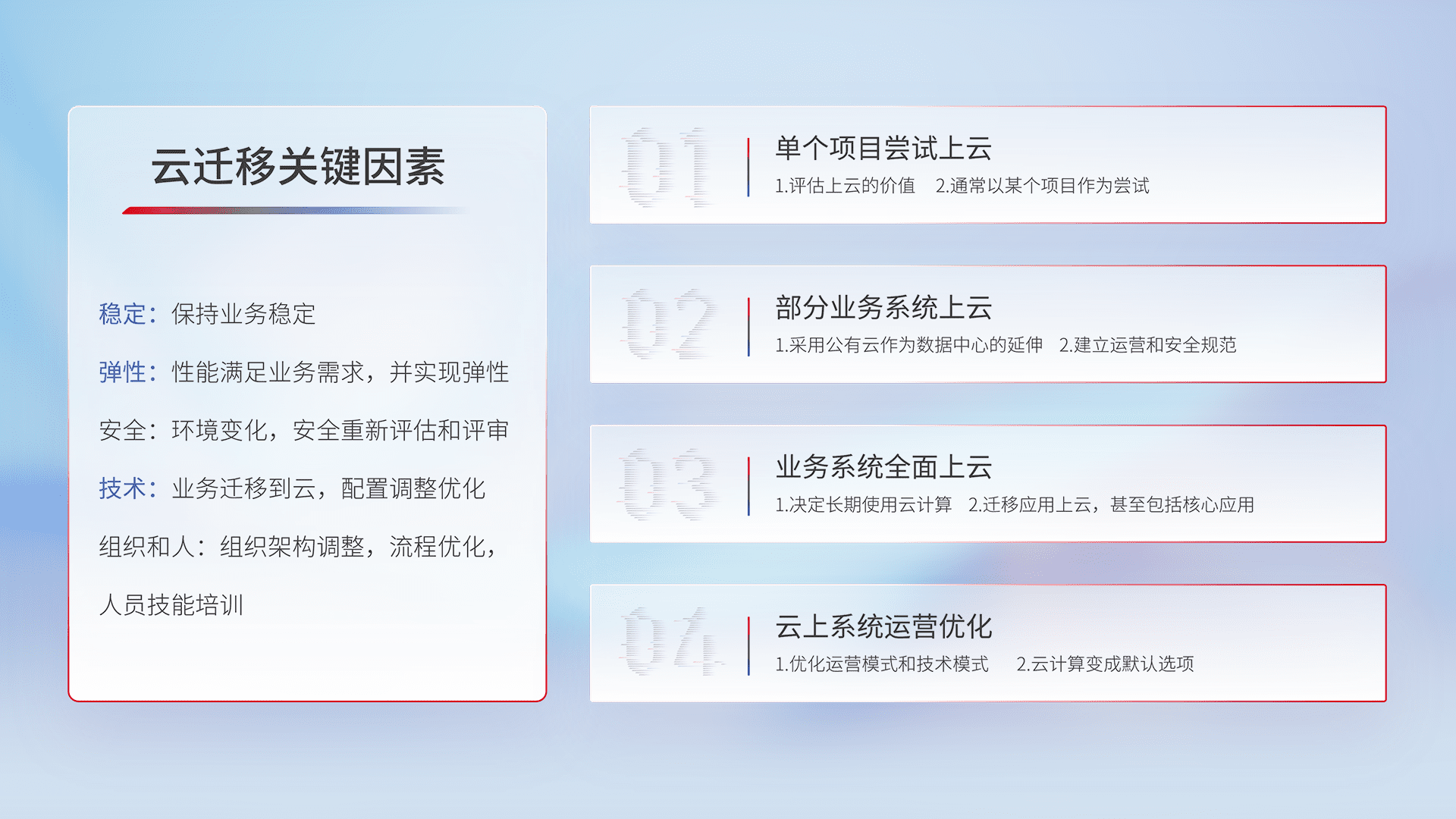 结合实际业务,,从规划设计、、、、云平台选型、、、、云原生改造、、、、数据迁移、、集成交付,,迁移全过程为客户识别最佳上云路径,,做好风险识别管理,,,设计网络架构、、身份权限、、、安全审计合规、、、操作审计、、、日志审计、、、、监控告警策略、、、多站点容灾设计等,,对云上基础设施进行整体规划,,,,提升IT治理水平,,,以满足弹性、、、高可用、、、高性能的需求。。。。